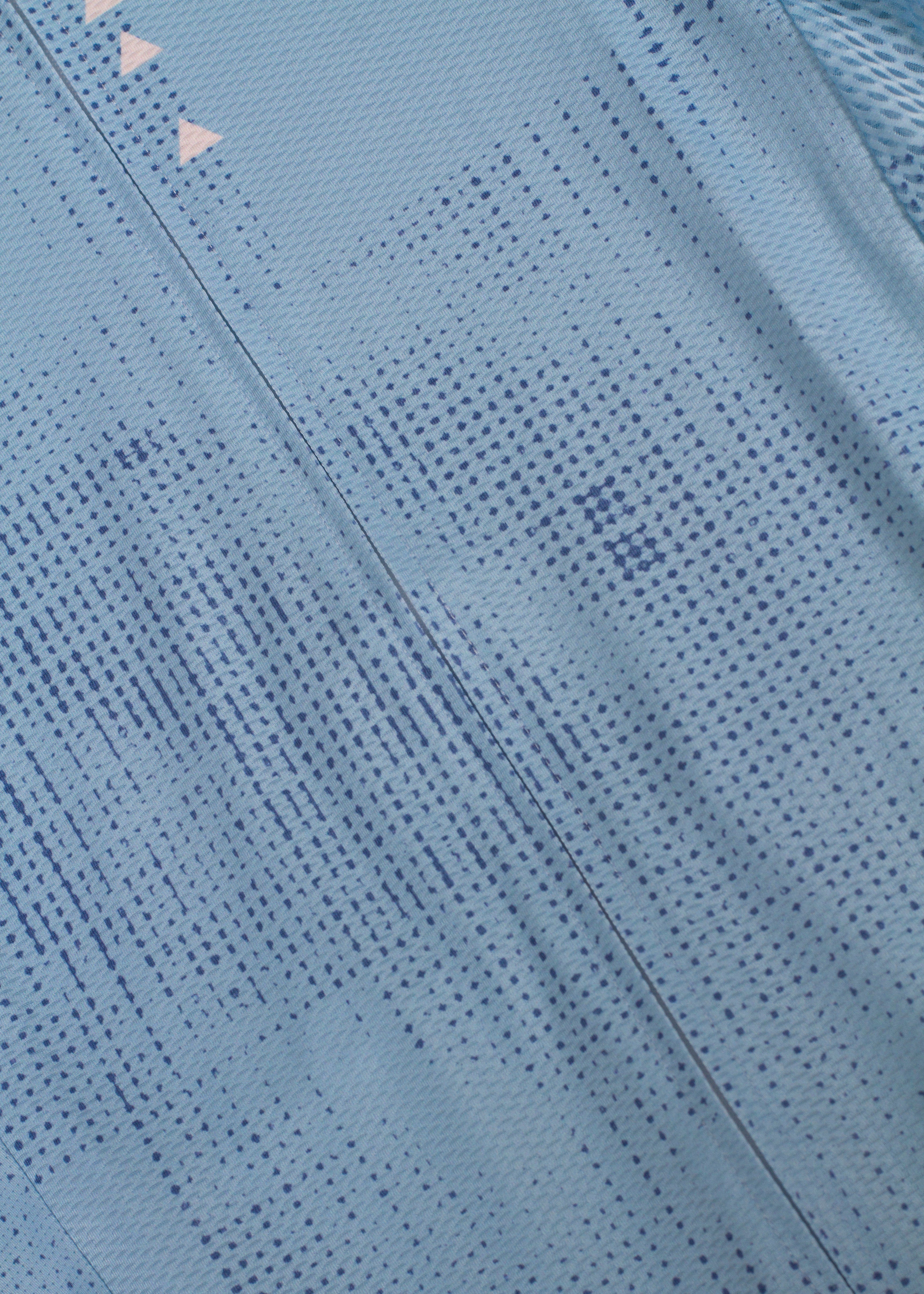 This Jersey is a blue and grey print with white logos.