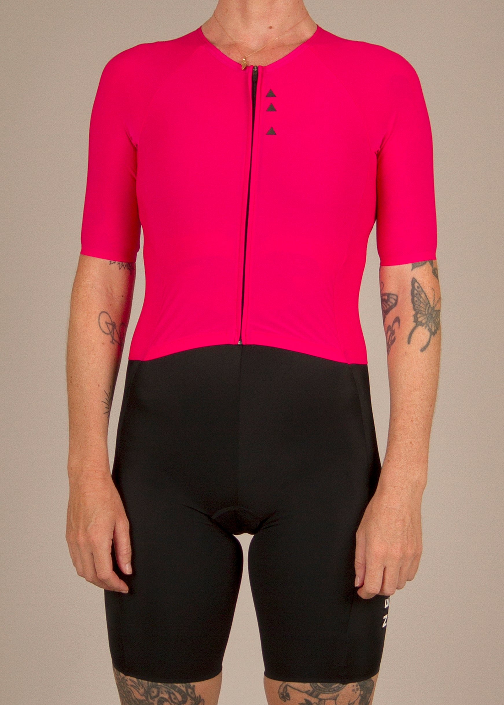 Precision Tri Suit Paneling – Full-length front zip with separate upper and high-waisted lower panels for enhanced comfort, flexibility, and a secure fit across all disciplines.