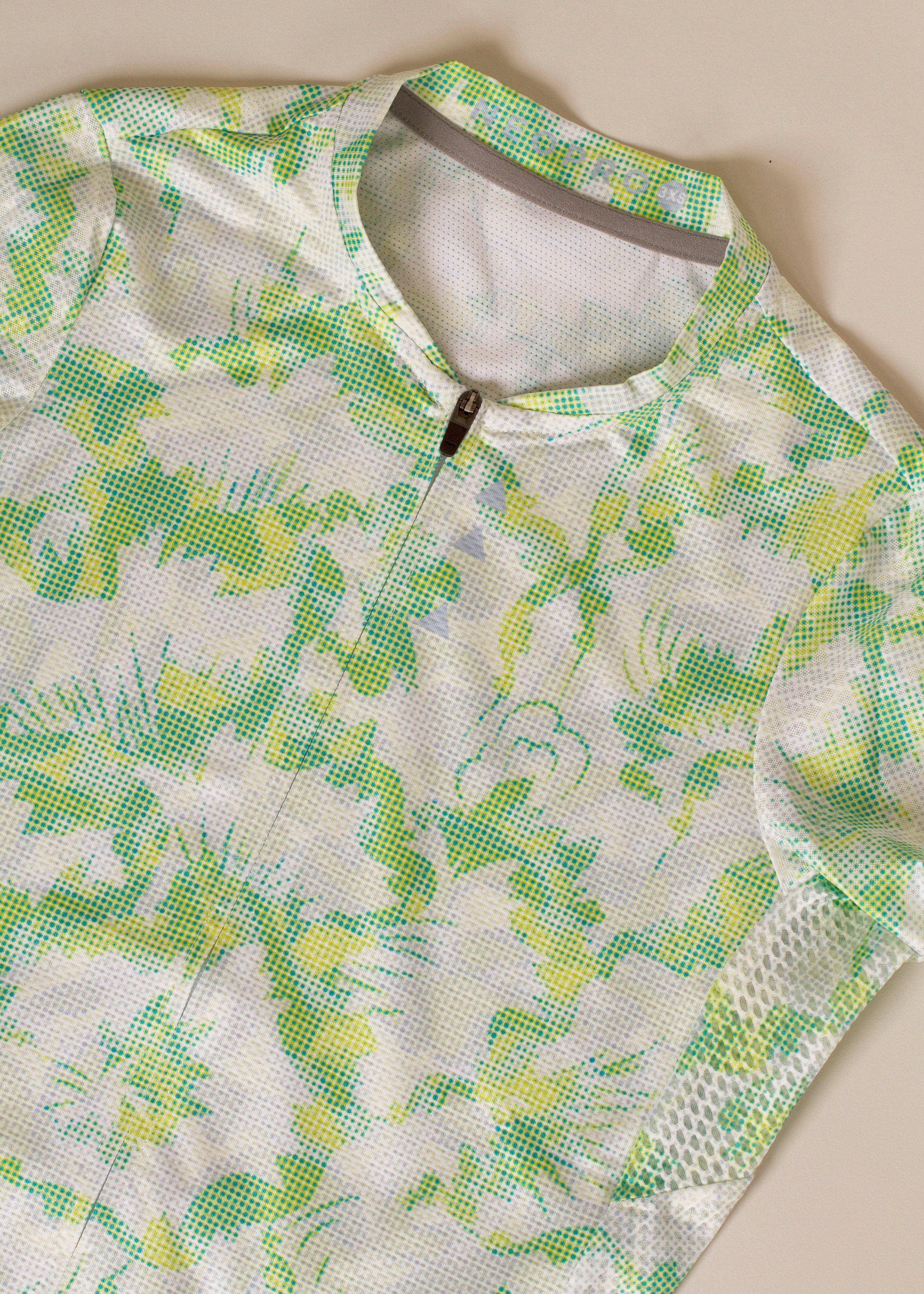 This Jersey is a green, lime, grey and white patterned print.